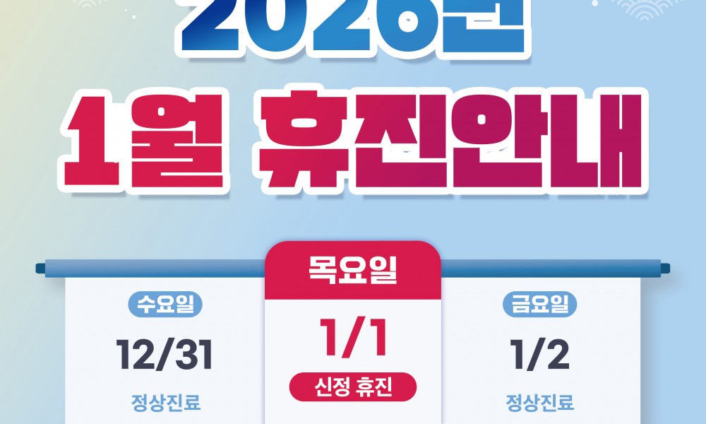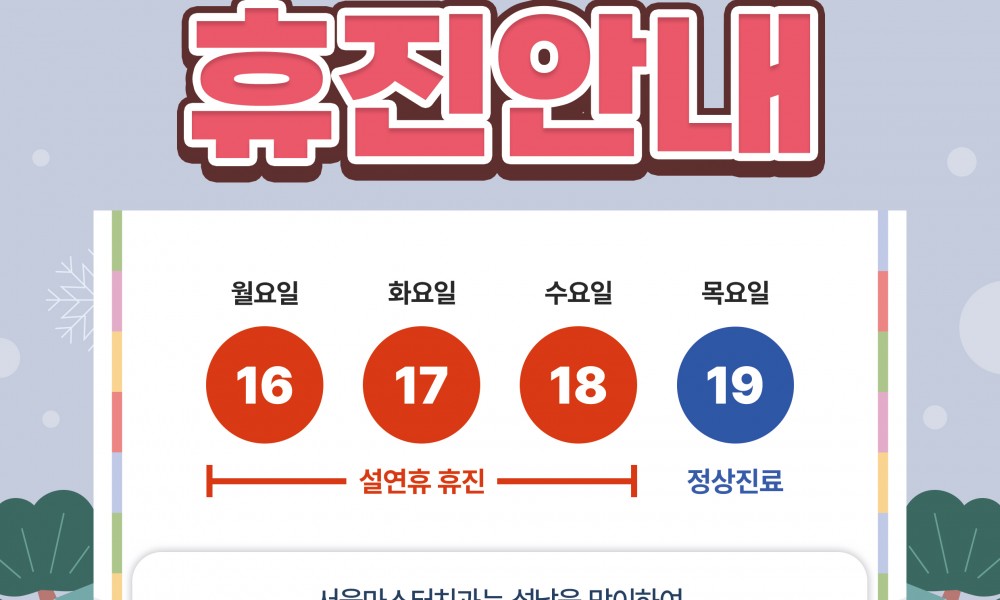 서울마스터치과는 1월 1일(수) 신정, 1월 27일(월), 1월 28일(화)~1월 30일(목) 설날 연휴로 인해 휴진입니다.