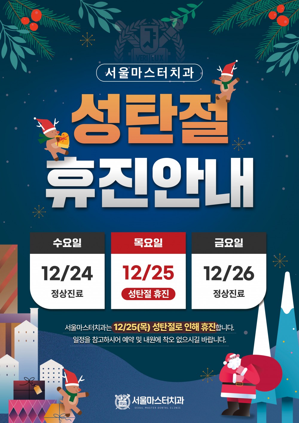 서울마스터치과 성탄절 휴진 안내 페이지 정보 작성자 서울마스터치과의원 관련링크 본문 서울마스터치과는 12월 25일 성탄절로 인해 휴진 합니다. 휴진일정 확인하시어 병원 이용에 착오 없으시길 바랍니다 :)